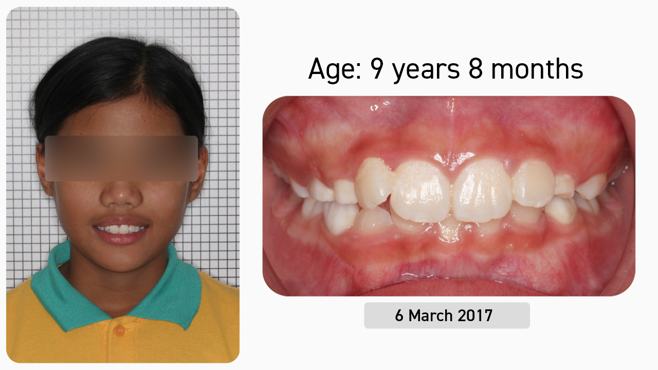 This nine-year-old female patient presented with the chief complaint of crowded and crooked teeth and was seeking a second opinion as she did not want braces and extractions. After being presented with the various treatment options, the decision was made to undertake Myobrace® treatment. This involved the use of Myobrace® appliances, in conjunction with the BWS arch expansion appliance, and the Myobrace® Activities.