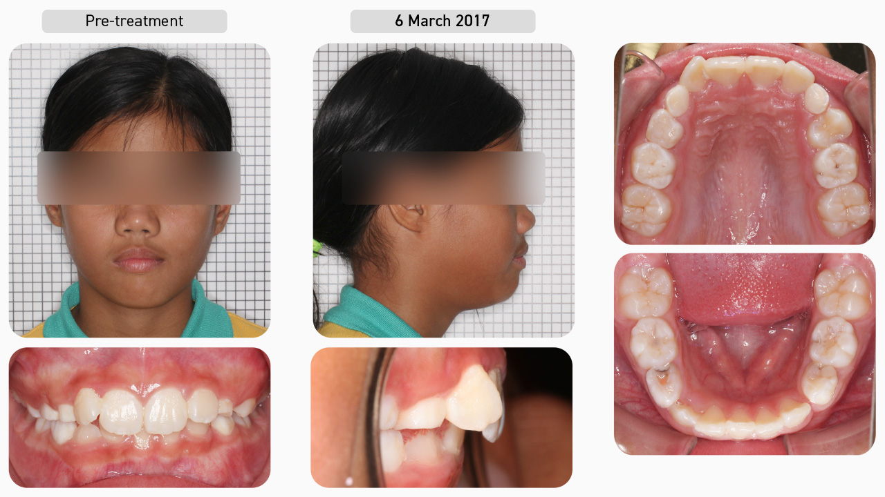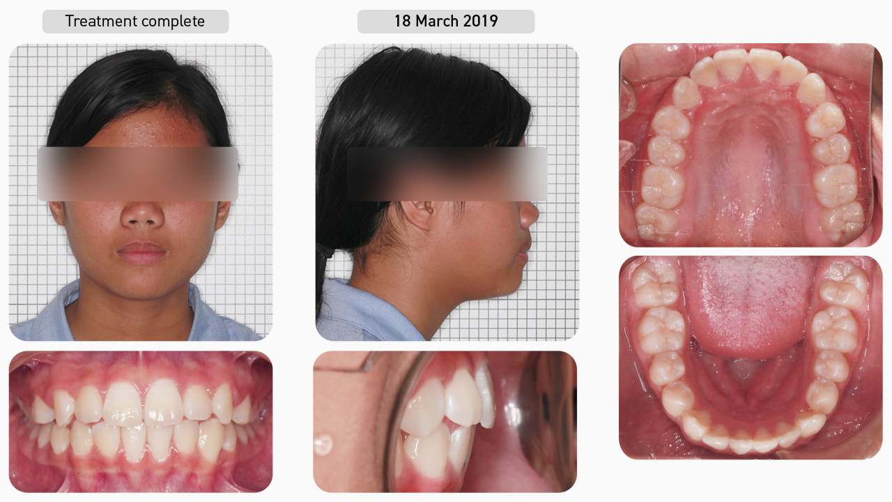 Using the Myobrace® appliances in conjunction with BWS arch expansion and the Myobrace® Activities, we have helped the patient to establish nasal breathing, correct her myofunctional habits and, therefore, achieve natural alignment of the teeth. The arch forms have improved significantly, and the deep bite and increased overjet have resolved. Notably, space has been gained for the initially blocked out lower left canine, and the patient has successfully avoided fixed braces and extractions. Although the alignment of the lower left canine is not perfect, it is important to understand that in Myobrace® treatment we are not concerned with dental ‘perfection’ as we are seeking natural alignment of the teeth, which occurs in conjunction with habit correction. With the correct breathing and muscle habits maintained, we expect the patient to continue improving in their dental development and good stability of the results.