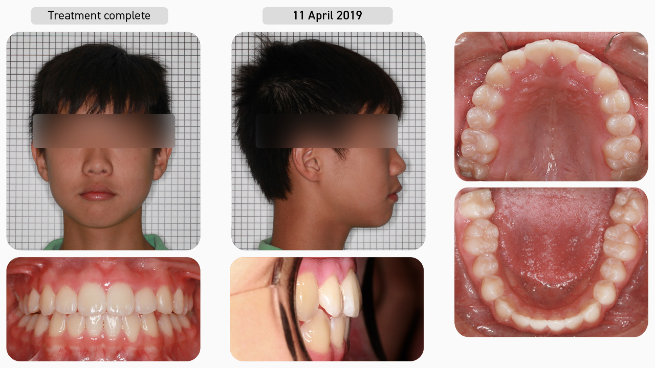 Using the Myobrace® appliances in conjunction with BWS arch expansion and the Myobrace® Activities, we have helped the patient to establish nasal breathing, correct his myofunctional habits and, therefore, achieve natural alignment of the teeth. The arch forms have improved, the teeth are well aligned, and the anterior crossbite has been corrected. In Myobrace® treatment, we are not concerned with dental ‘perfection’ as we are looking for natural alignment, occurring with habit correction. With the correct breathing and myofunctional habits maintained, we expect the patient to continue improving in their dental development and good stability of the results into the future.